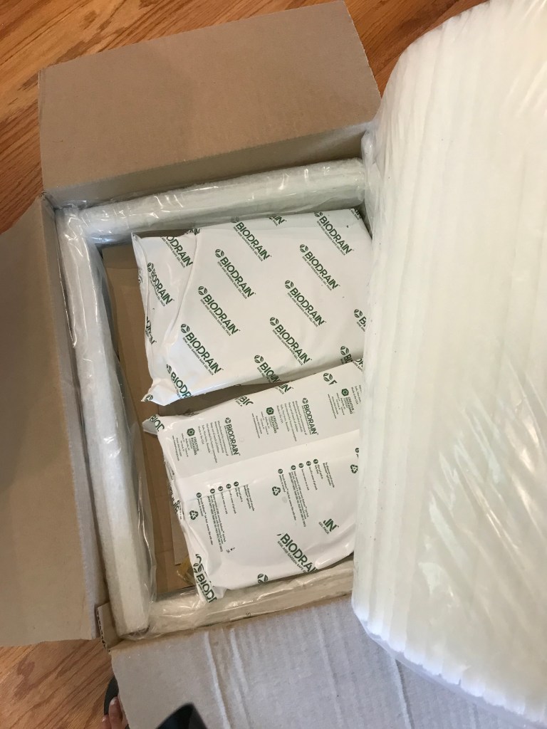 It was well packed, cushioned and had ice packs to keep the foods cool. They had only just started to melt. They are biodegradable and the gel can go down the sink (following directions). However, I don’t know how safe it is for septic systems. They are also reusable, so I chose to put them in the freezer. They’ll make good ice packs for boat trips and keeping things cool down on the dock.